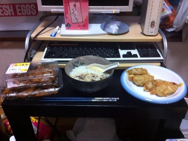 夜:無印良品の「ごはんにかける 奄美大島風 鶏飯」、職場で貰った揚げ餃子、軟骨のからあげ、ガーリックポテト。相当油分多めだが人と食べていたのでこういう日もある。