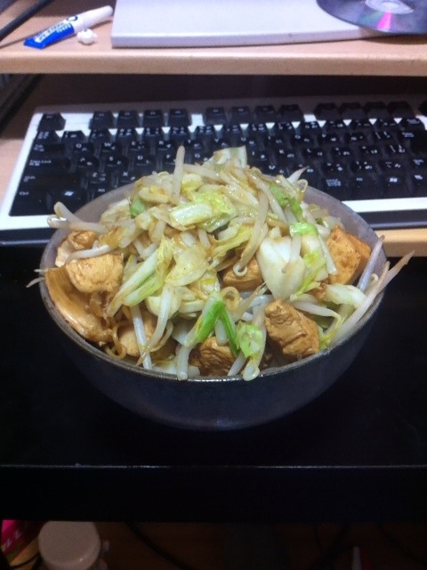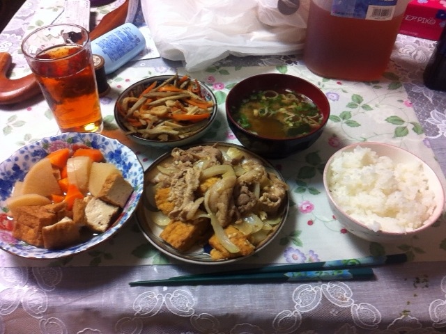 夜:実家で作った玉ねぎと豚肉と厚揚げの炒め、インスタント味噌汁、ごはん、煮物、きんぴらごぼう。